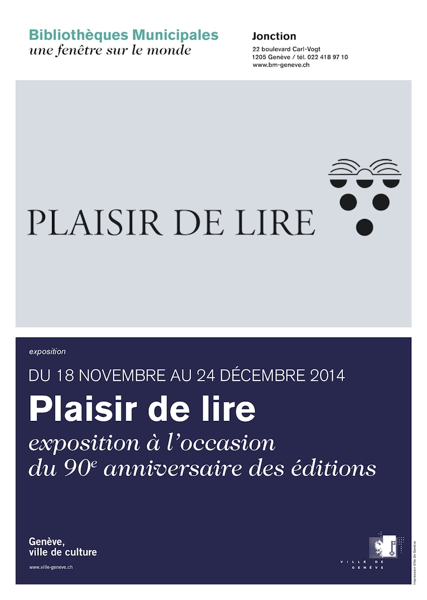 Les Bibliothèques municipales de la Ville de Genève – Jonction accueillent du 18 novembre au 24 décembre 2014 l’exposition itinérante consacrée aux 90 ans des Editions Plaisir de Lire.