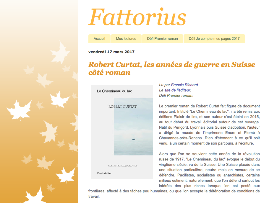 Sur le blog de Daniel Fattore, une belle chronique sur « Le chemineau du lac » de Robert Curtat.