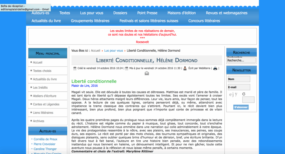 Deux de nos auteurs participeront ce week-end au Salon du Livre Romand de Fribourg. Il s’agit d’Hélène Dormond et Marc Voltenauer. Hélène Dormond: Samedi 19 novembre, 10h à 11h, Salle Gottéron: Table ronde sur le thème « La loyauté » Avec Sabine Dormond, Denise Campiche, Anne Bottani, Hélène Dormond, André Ourednik. Modération : Daniel Bernard Dédicaces de Liberté […]