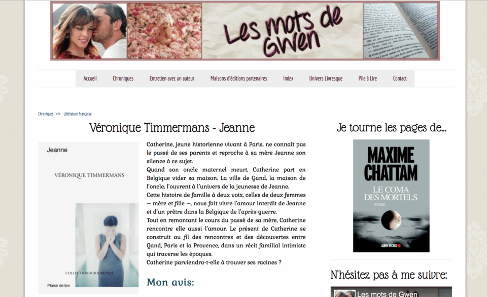Découvrez sur le blog Les Mots de Gwen, une chronique de Jeanne, premier roman de Véronique Timmermans. Petit extrait ci-dessous: En voilà une très belle lecture ! (…) j’ai adoré découvrir l’histoire de Jeanne grâce à l’alternance des époques. (…) J’adore ce style, j’aime ce frisson ressenti en m’approchant de la révélation et hop ! devoir revenir […]