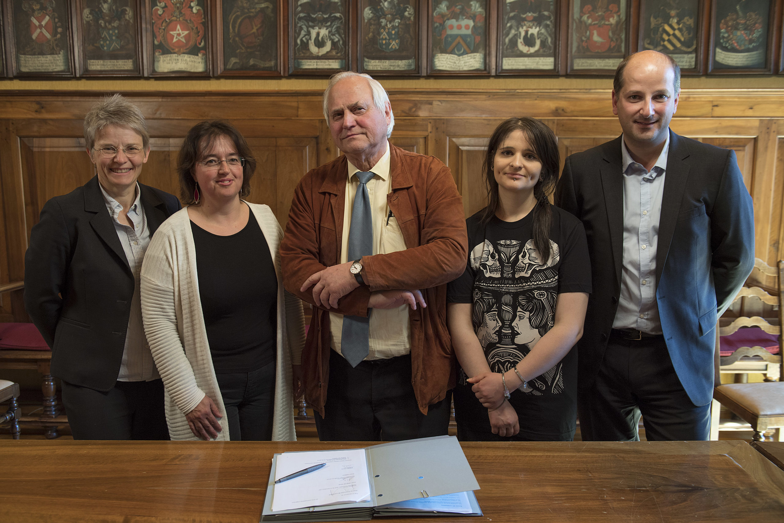 L’Etat de Vaud et la ville de Lausanne signent des conventions avec 3 editeurs vaudois. mardi 19 avril 2016. La Conseillere d’Etat Anne-Catherine Lyon, Isabelle Cardis Isely, editions Plaisir de lire, Michel Moret, editions de l’Aire, Andonia Dimitrijevic Borel, editions l’Age dhomme, Gregoire Junod, syndic elu ARC Jean-Bernard Sieber