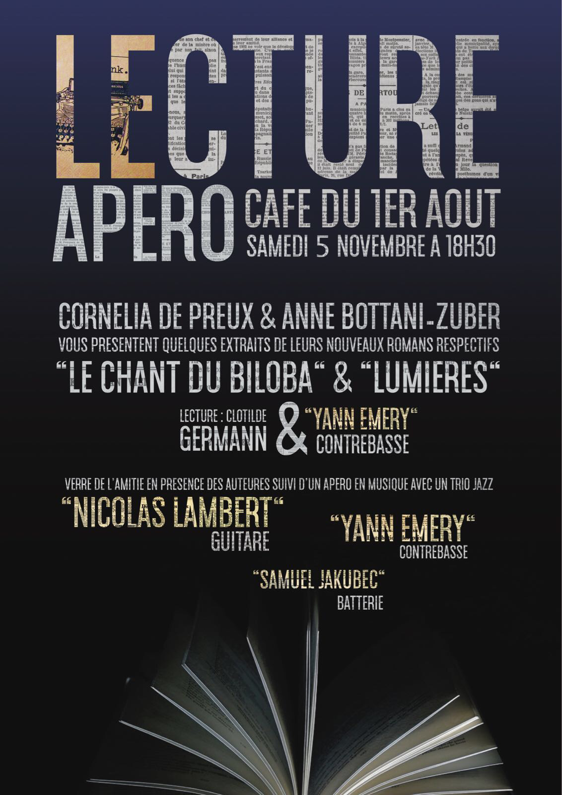 Le samedi 5 novembre, dès 18h30, Cornélia de Preux sera au Café du 1er Août à Muraz sur Sierre, en Valais. Elles vous présentera des extraits de son nouveau roman, Le Chant du Biloba. Elle sera accompagnée de Anne Bottani Zuber qui présentera son roman Lumières.