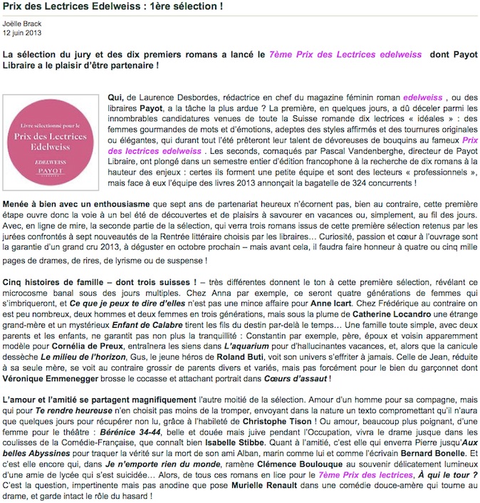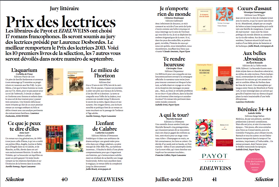 • Sélection du Prix des lectrices Edelweiss & Payot 2013:
