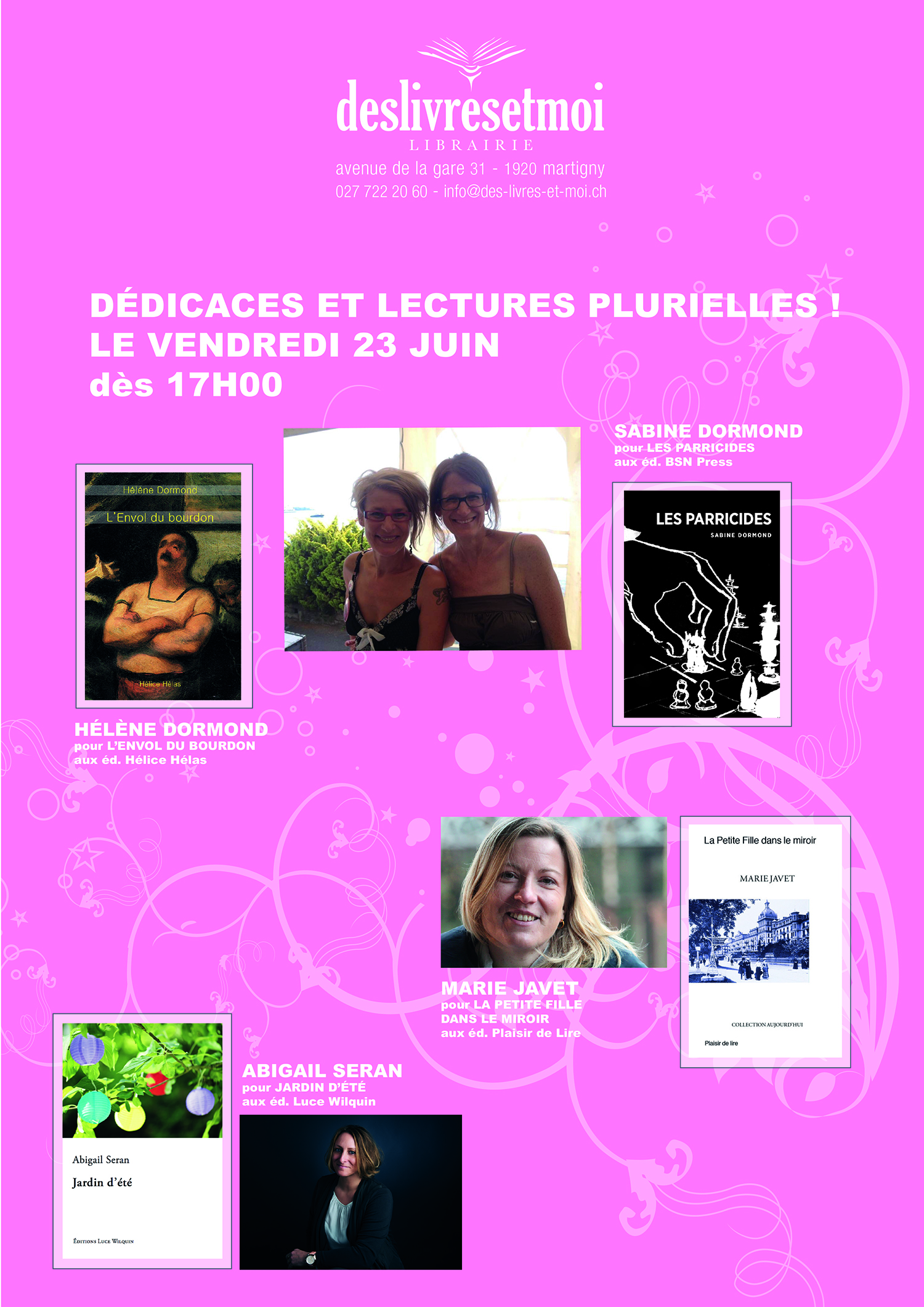 Marie Javet dédicacera La Petite Fille dans le miroir aux côtés de Abigail Seran (Jardin d’été, Luce Wilquin), Hélène Dormond (L’Envol du bourdon, Hélice Hélas), et Sabine Dormond (Les parricides, BSN Press) à la librairie Des Livres et Moi de Martigny le samedi 23 juin dès 17h.