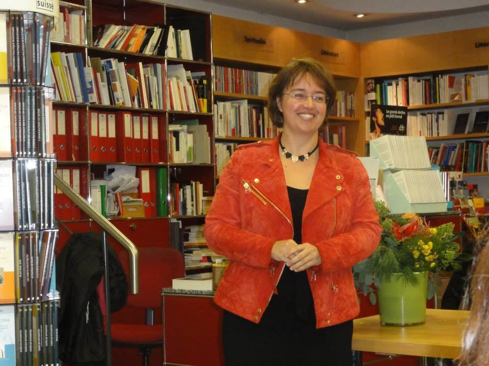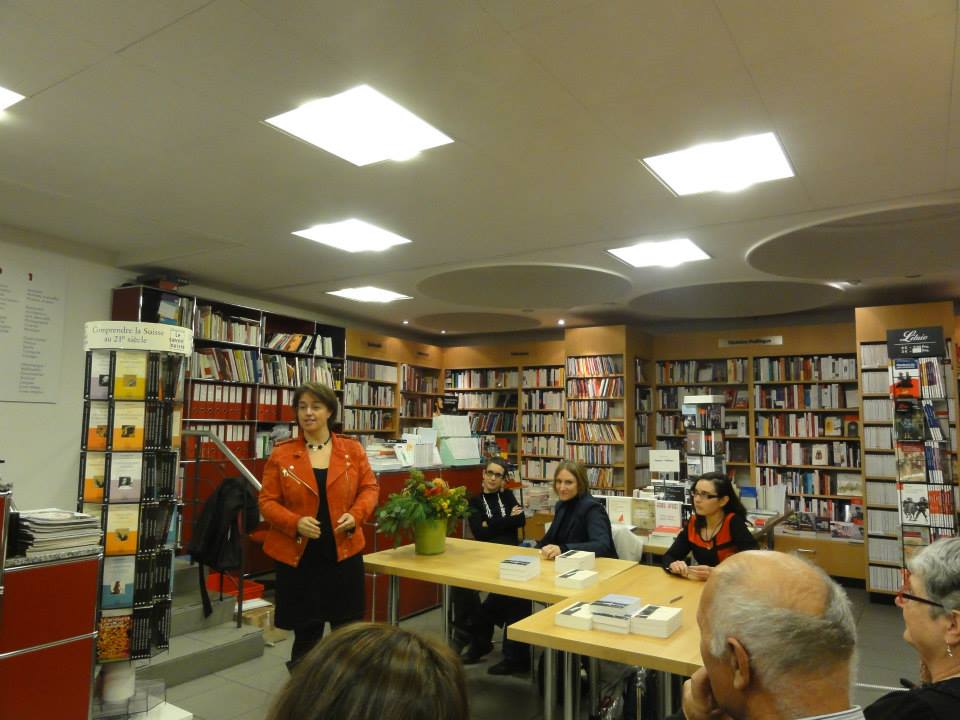 Isabelle Cardis Isely, Présidente de l’Association Plaisir de Lire, devant le public présent pour écouter les auteures.