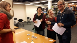 Hier à la bibliothèque Chauderon, ambiance sympathique et chaleureuse autour d’un jeu de l’oie particulier, qui a conduit les lecteurs d’une coin à l’autre de la bibliothèque, à la rencontre des auteures Tiffany Jaquet, Annik Mahaim, Véronique Timmermans, Abigail Seran, Hélène Dormond, Cornélia de Preux et Rachel Zufferey. Une soirée de dégustations, parfums, quizz et autres expériences originales. Les participants se sont prêtés au jeu ont su retrouver quel univers littéraire appartenait à qui. Bravo et merci à eux, à Tulalu !? et à toute l’équipe des bibliothécaires de Chauderon…