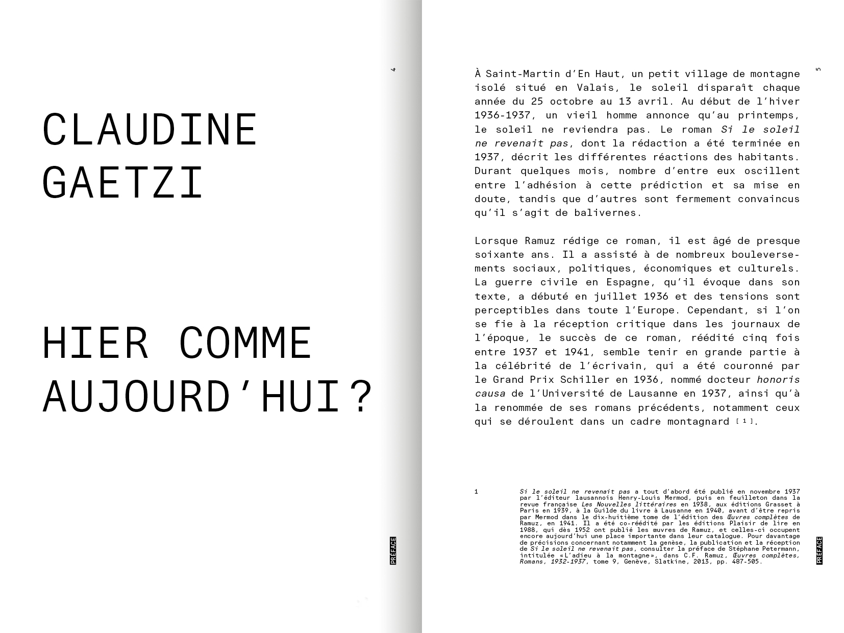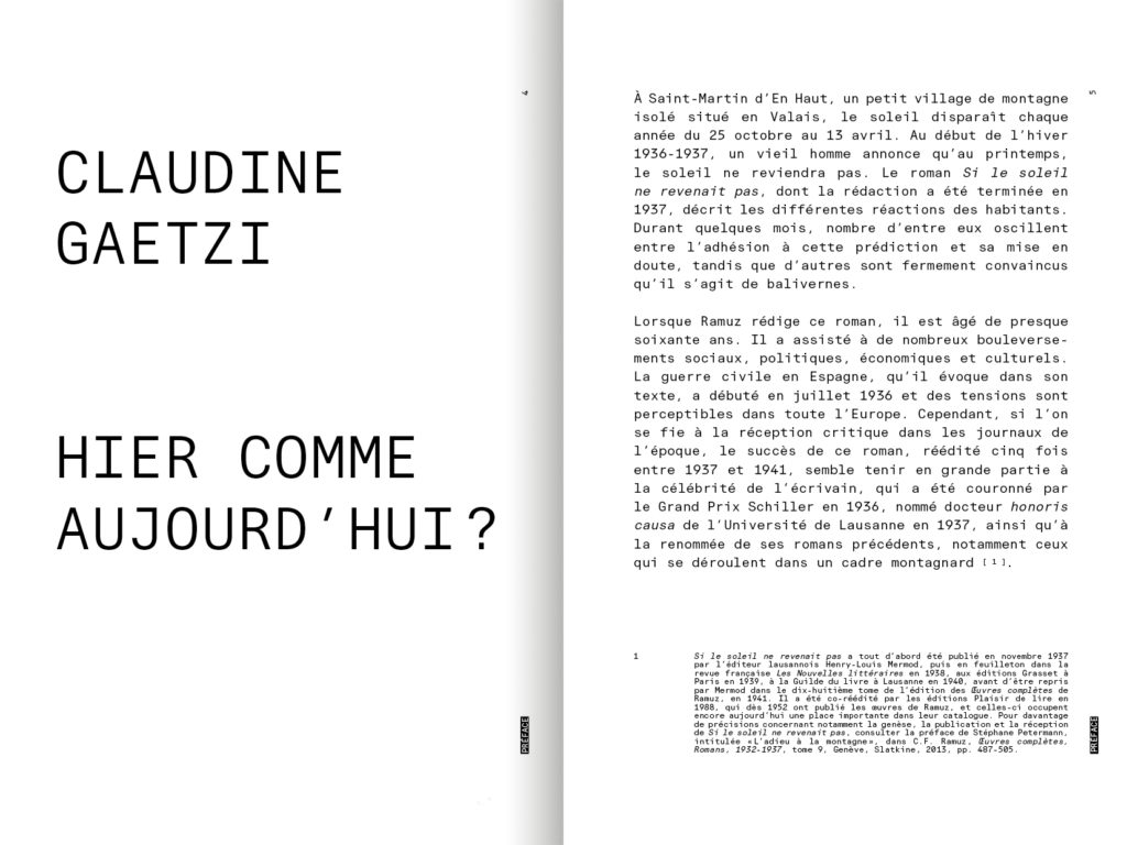 Hommage à Ramuz et son rapport à la nature et ses écrits humanistes, la mise en page est construite selon le « canon de division harmonieuse » de Villard de Honnecourt, maître d’œuvre du XIIIe siècle qui fut notamment présent sur le chantier de Notre-Dame de Lausanne. Cette méthode est utilisée en typographie pour obtenir les proportions des marges dans le cadre d’une mise en page. On retrouve cette même construction dans les plans des cathédrales, chefs-d’œuvre de lumière et de proportions dorées. Repenser le classique, mais dans une version contemporaine passe notamment par les choix typographiques. La police de caractères Times New Roman, souvent cliché, car standard vient contrebalancer l’Alpaga créée par la fonderie lausannoise Newglyph.