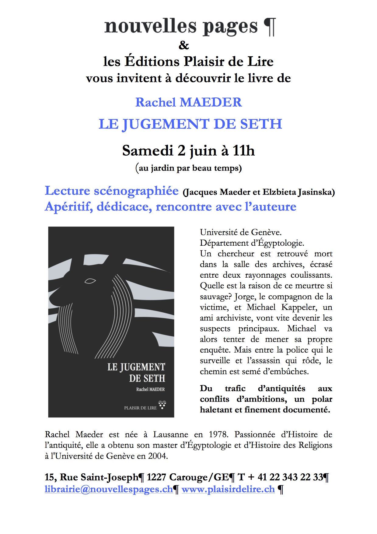 Samedi 2 juin à 11 heures, rendez-vous à la librairie Nouvelles Pages à Genève (15, rue St-Joseph, voir plan) pour une lecture scénographiée du Jugement de Seth, le polar de Rachel Maeder paru dernièrement aux Editions Plaisir de Lire. La lecture sera suivie d’un apéritif et d’une séance de dédicaces. Venez nombreux!