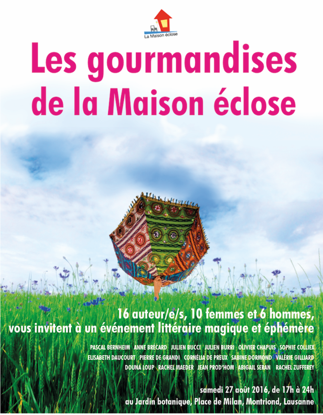 La maison éclose, ce sont 16 auteur(e)s, 10 femmes et 6 hommes, qui vous proposent un événement littéraire, festif, gustatif et éphémère, autour de… la gourmandise!