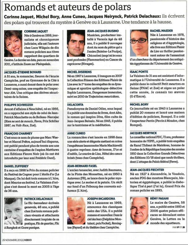 • L’Hebdo, du 29 novembre 2012, « Romands et auteurs de polars »: