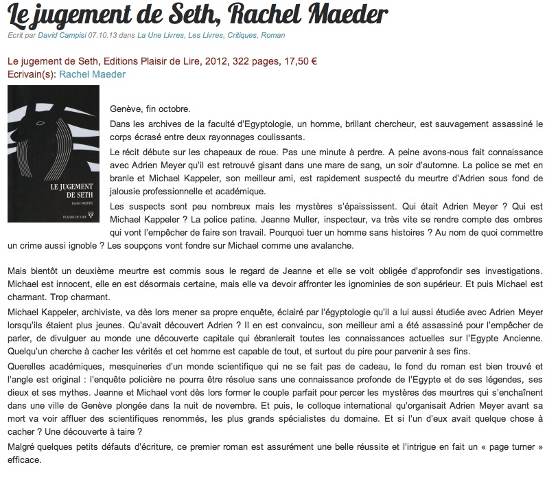 "Le Jugement de Seth" sur La Cause littéraire.