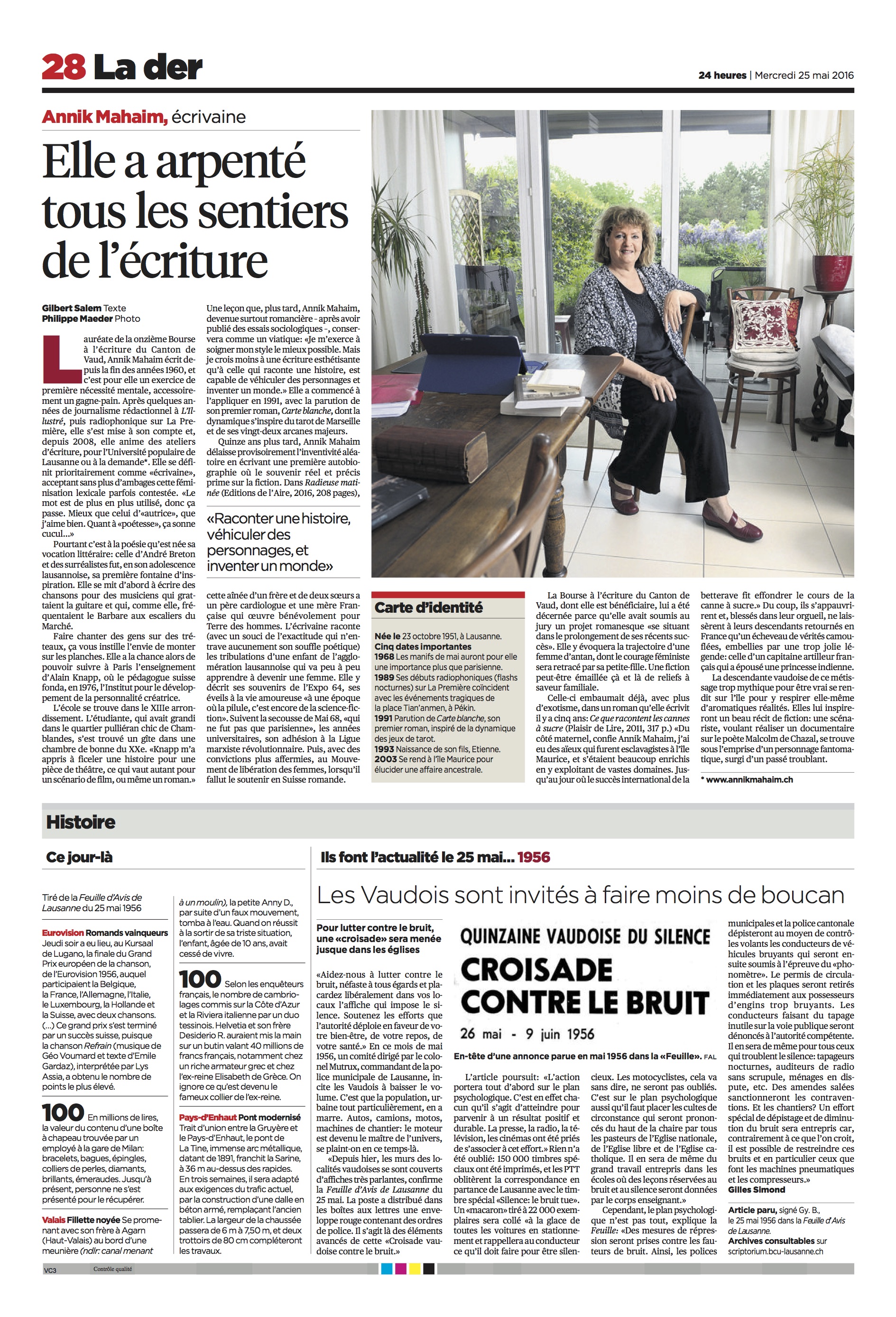 Annik Mahaim, romancière, comédienne, militante et nouvelliste, est née le 23 octobre 1951 à Lausanne de père suisse et de mère franco mauricienne. Enfant, elle rêvait de devenir danseuse, puis adolescente chanteuse de jazz. Diplôme de lettres en poche, elle entame une première carrière d’artiste interprète sur les planches, avant de trouver dans le journalisme une carrière idéale pour son caractère libre et curieux de comprendre le monde.  Elle travaille d’abord à l’Illustré puis à la rédaction de la RTS, sans renoncer à une carrière d’autrice ! Elle sort son premier roman Carte Blanche en 1991 aux éditions de l’Aire et entame sa collaboration avec les éditions Plaisir de Lire en 2011 avec qui elle publiera trois livres : Ce que racontent les cannes à sucre, en 2011, Pas de souci en 2015, La femme en rouge en 2018.  En 2016, elle est lauréate de la Bourse de l’écriture du canton de Vaud. Femme de combats et de convictions, Annik Mahaim fut toute sa vie une ardente militante de la cause féministe, rejoignant les rangs du MLF dès les années 70 ou compagne engagée de la première grève des femmes en Suisse en 1991 et a œuvré dans de nombreux ateliers d’écriture pour former les nouvelles générations d’autrices et d’auteurs. Elle est décédée le 17 janvier 2024.