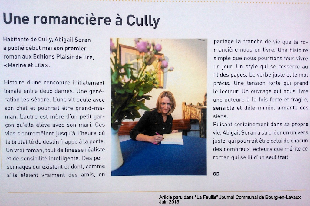 Paru dans la Feuille de Bourg-en-Lavaux en juin 2013, un article sur Marine et Lila, premier roman d’Abigail Seran, qui est décrit comme: