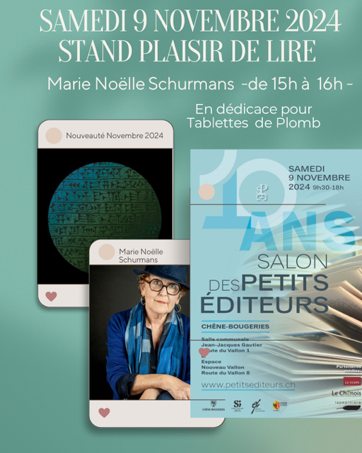 Sur le stand Plaisir de Lire, il y aura des surprises …pour préparer Noël, nous fêterons la sortie du livre de Marie Noëlle Schurmans, autrice des Tablettes de Plomb qui sera en dédicace pour la sortie de Tablettes de Plomb . Francine Crettaz et Maxime Rustchmann nous rejoindront aussi après leurs tables rondes.
