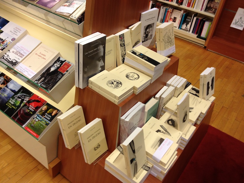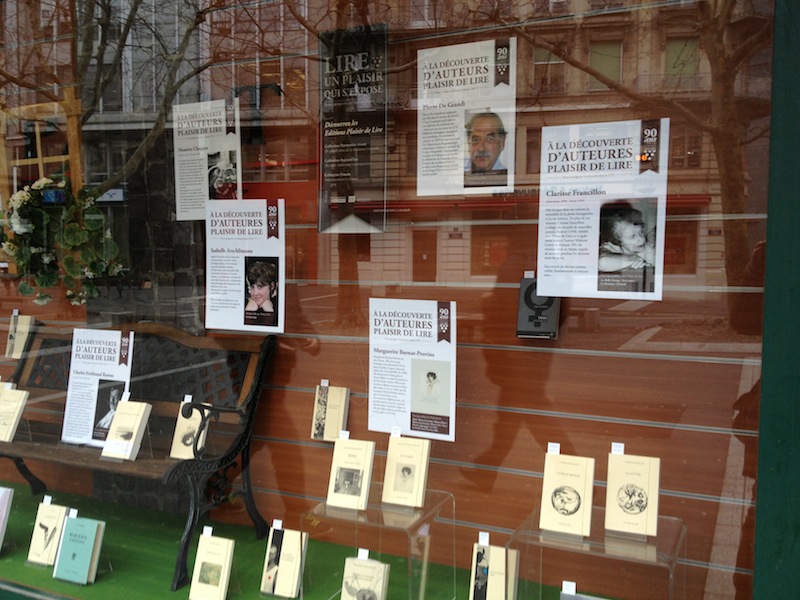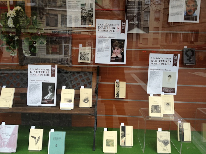 Quelques photos de la belle vitrine de la librairie Payot (Place Pépinet, Lausanne), en l’honneur des 90 ans de Plaisir de Lire, et du stand qui est consacré à notre maison d’édition, près du secteur de littérature suisse…