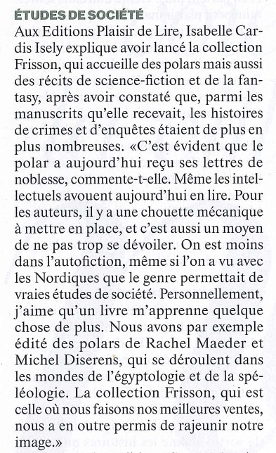 Les Editions Plaisir de Lire ont lancé la collection Frisson pour donner une place à ce genre, une collection qui compte actuellement neuf titres, dont les récents Vengeance d’orfèvre d’Andrea Fazioli et Qui ne sait se taire nuit à son pays de Rachel Maeder.