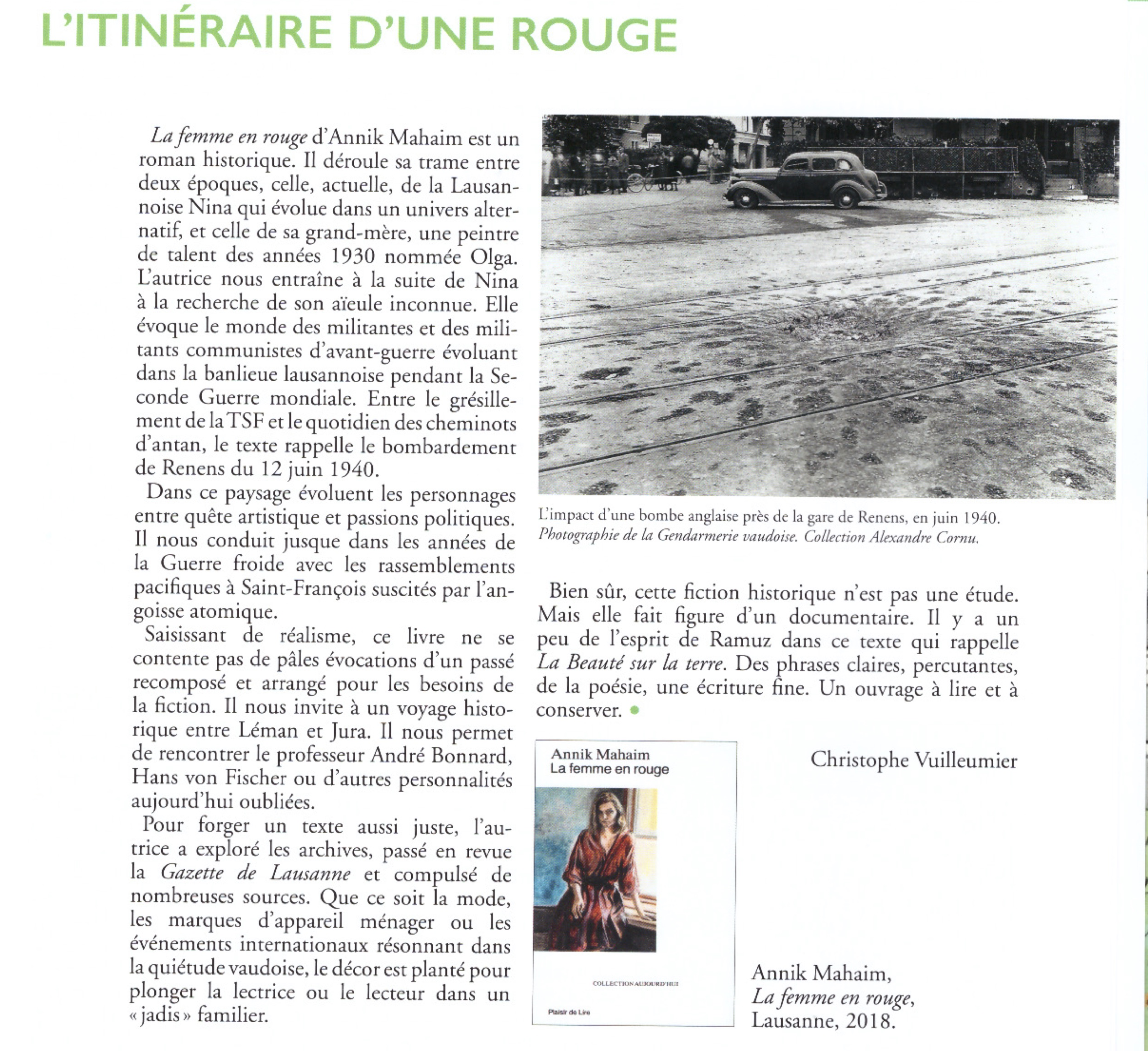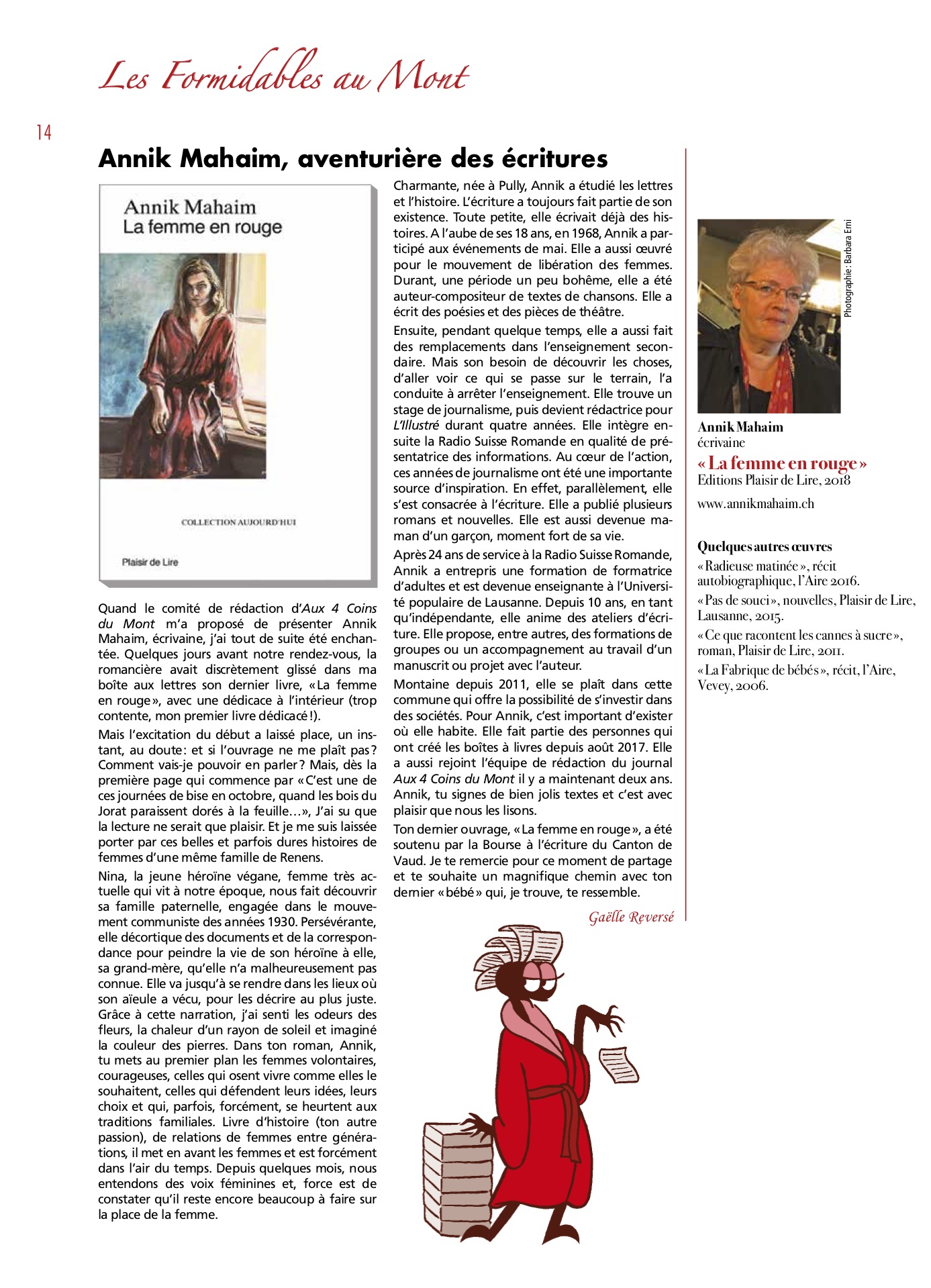 Annik Mahaim, romancière et nouvelliste, vit au Mont-sur- Lausanne. Elle a emprunté de multiples chemins d’écriture, chanson, textes pour la scène, journalisme, radio, publications historiques. Lauréate du prix Bibliomedia 1991, Sélection Lettres Frontières 1995.