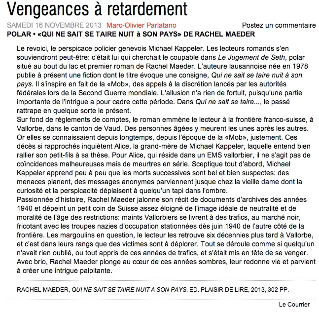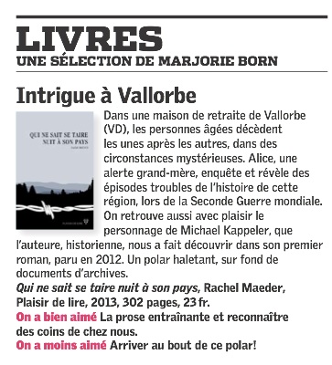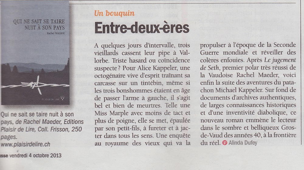 Sur fond de Seconde Guerre mondiale et de règlements de comptes, ce polar nous emmène à Vallorbe, à la frontière franco-suisse. Des personnes âgées meurent les unes après les autres, simple coïncidence ou meurtres en série? Alice penche pour cette dernière hypothèse et tente de rallier son petit-fils Michael à sa cause. Il s’agira alors d’interroger le passé en retournant dans les années 40, quand la guerre laissait place à des commerces parfois douteux.