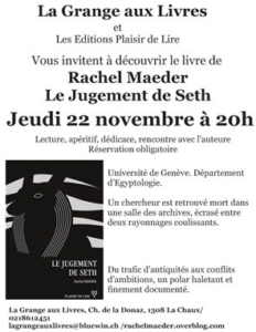 Jeudi 22 novembre à 20 heures, à la Grange aux Livres, à La Chaux (chemin de la Donaz), vous pourrez rencontrer Rachel Maeder, auteure du thriller sur fond d’égyptologie et de trafic d’antiquités Le Jugement de Seth. Lecture, dédicace, et apéritif vous y attendent…