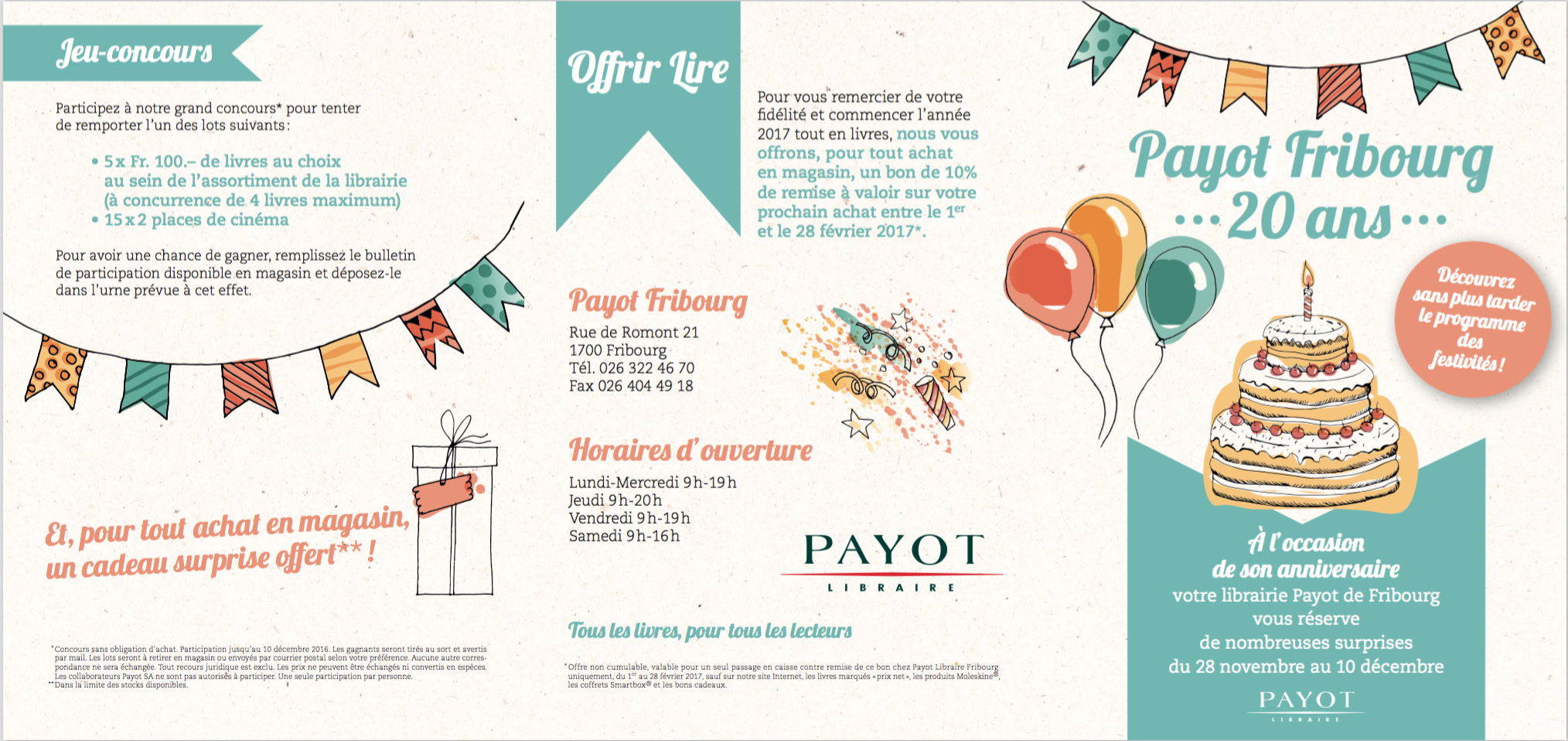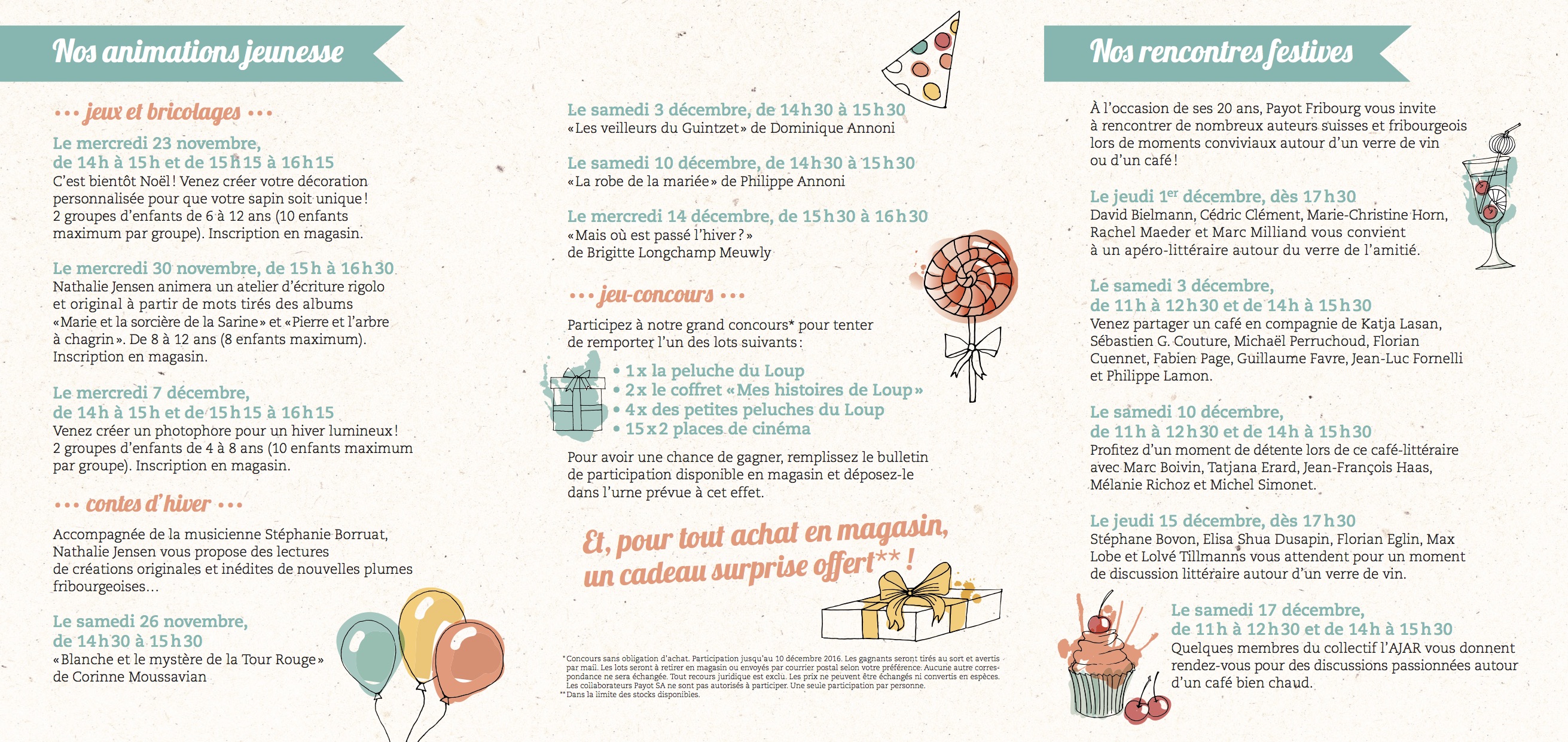 Jeudi 1er décembre, de 17h30 à 20h, Rachel Maeder sera en dédicaces chez Payot Fribourg (Rue de Romont 21) dans le cadre de la célébration du 20e anniversaire de la librairie. Il s’agit d’un apéro littéraire qui réunira également les écrivains David Bielmann, Cédric Clément, Marie-Christine Horn et Marc Milliand et les lecteurs autour d’un verre de l’amitié.