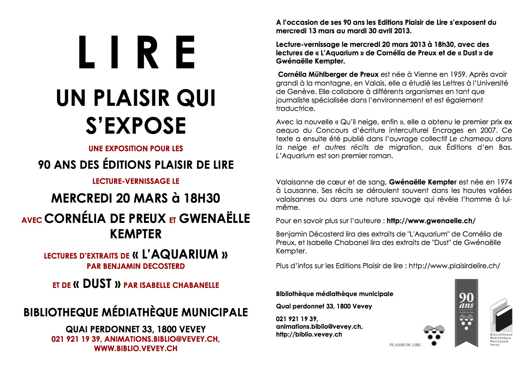 Le vernissage pour les 90 ans de Plaisir de Lire se tiendra le mercredi 20 mars à 18h30, avec Cornélia de Preux et Gwénaëlle Kempter. Lectures d’extraits de L’Aquarium par le comédien Benjamin Décosterd et de Dust par la comédienne et auteure Isabelle Chabanel.