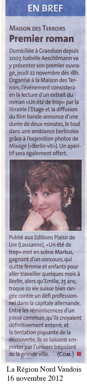 Jeudi 22 novembre, à 18 heures, à la Maison des Terroirs de Grandson, Isabelle Aeschlimann sera présente pour dédicacer son premier roman, Un été de trop. Lecture d’un extrait de l’oeuvre, diffusion de la bande-annonce et exposition photos de Berlin (« Berlin vit », présenté par la photographe Mixage) sont au programme. L’événement est organisé par la Maison des Terroirs, en collaboration avec la libraire « L’Etage », d’Yverdon.