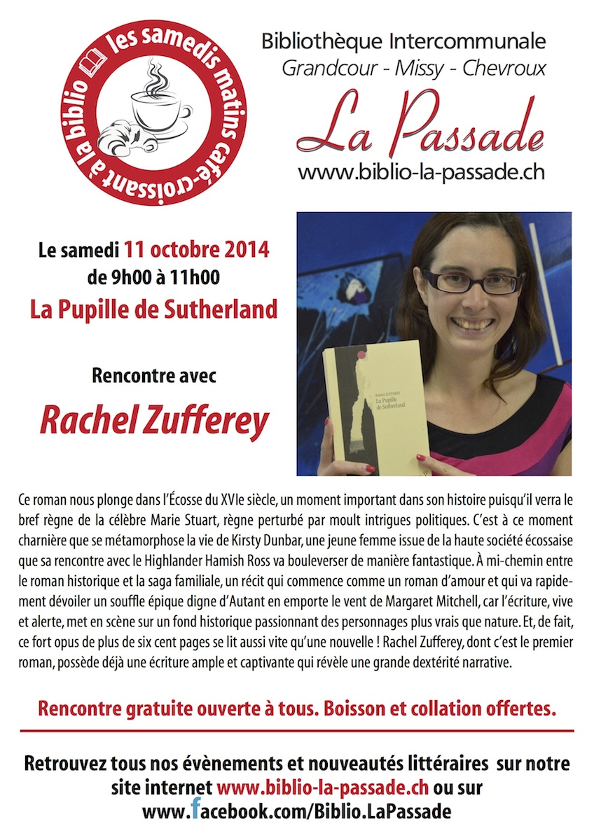 L’auteure de La Pupille de Sutherland vous donne rendez-vous le samedi 11 octobre 2014, de 9h à 11h, à la Bibliothèque intercommunale La Passade à Grandcour, pour une rencontre café-croissant.