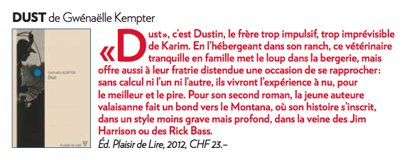 Revue de presse: « Dust » de Gwénaëlle Kempter dans Marie Claire SuissePar Marie Javet / 28 septembre 2012 Dans le numéro de Marie Claire Suisse du mois d’octobre 2012, un article sur Dust, le dernier roman de Gwénaëlle Kempter: