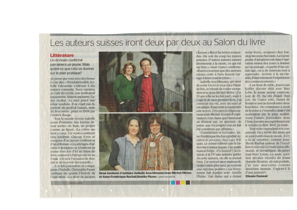 La Tribune de Genève du 6 février 2013 évoque le programme Parrains & Poulains, imaginé par Isabelle Falconnier dans le cadre du Salon du Livre de Genève, édition 2013, et qui consiste à réunir un écrivain débutant et un écrivain confirmé, afin que le premier profite de l’expérience du second, et que les deux viennent nous faire part de leurs fructueux échanges lors du Salon. L’article publie notamment une photo d’Isabelle Aeschlimann, auteure de Un Eté de Trop, et de son parrain, l’écrivain Jean-Michel Olivier. Cliquez dessus pour agrandir l’article.