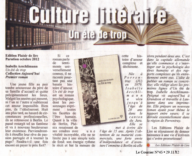 Article paru dans quotidien roman Le Courrier du 29 novembre 2012 (cliquez sur l’article pour l’agrandir), au sujet de Un été de trop, d’Isabelle Aeschlimann: