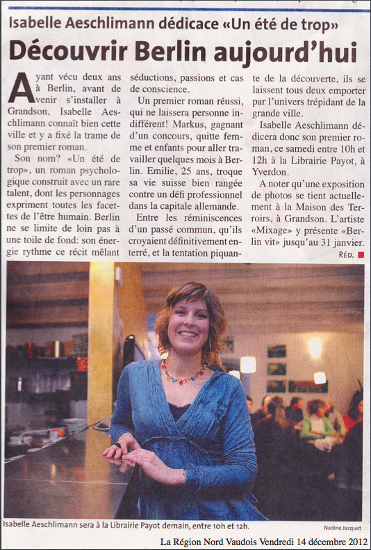 Dans le Journal Région Nord Vaudois du 14 décembre 2012, un article sur Un Eté de trop, premier roman d’Isabelle Aeschlimann, « un roman psychologique construit avec un rare talent, dont les personnages expriment toutes les facettes de l’être humain ». Cliquez sur l’article ci-dessous pour le découvrir dans son intégralité: