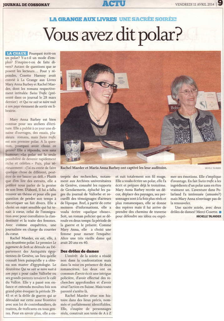 L'enseigne de La Grange aux livres. [lagrangeauxlivres.ch]La librairie La Grange aux livres, à La Chaux, a invité les auteures Rachel Maeder (Qui ne sait se taire nuit à son pays) et Mary-Anna Barbey (Swiss trafic) pour une soirée consacrée aux romans policiers le jeudi 3 avril 2014 à 20h.