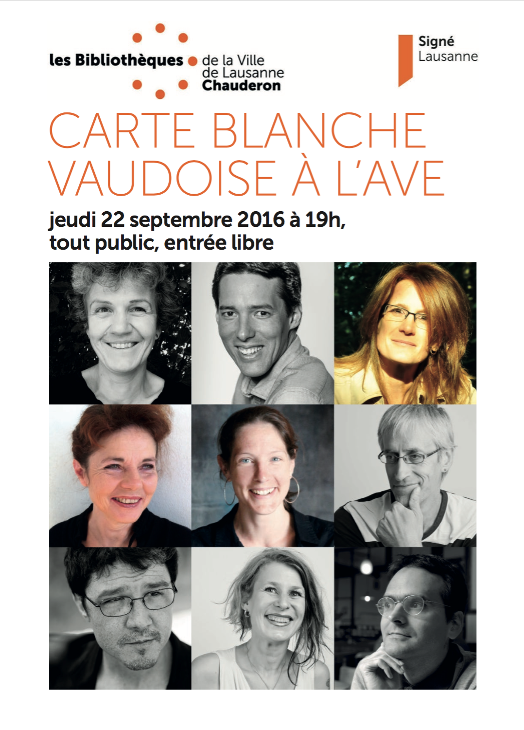Jeudi 22 septembre 2016 à 19h, l’Association vaudoise des écrivains (AVE), emmenée par Olivier Chapuis et Sabine Dormond, investit Chauderon avec neuf auteurs et leur actualité littéraire, soit Anne Bottani, Olivier Chapuis, Sabine Dormond, Philippe Lamon, Frédéric Lamothe, Anne-Frédérique Rochat et Bertrand Schmid, ainsi que deux de nos auteures, Cornélia de Preux (L’Aquarium, Le Chant du Biloba) et Hélène Dormond (Liberté conditionnelle)